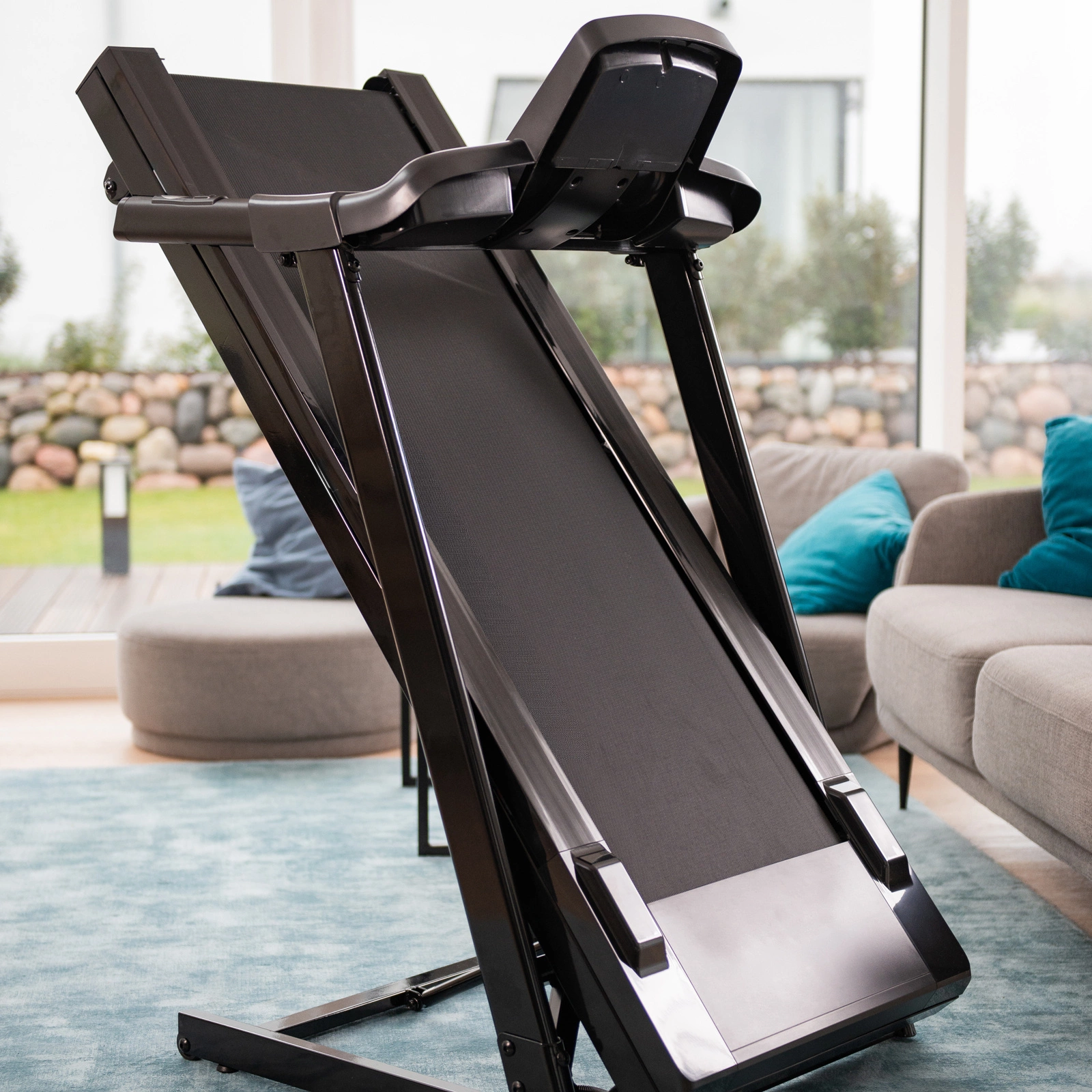 To je vynikajúci skladací bežecký pás, ktorý umožňuje ušetriť priestor vo vašom byte. Vďaka funkcii skladania a praktickým transportným kolieskami ho ľahko premiestníte a ušetríte miesto. Bežecký pás možno zložiť jednoduchým a rýchlym spôsobom, montáž trvá približne 15 minút. Vďaka systému Soft Drop bežecká plocha klesá pomaly a bezpečne, čo uľahčuje rozkladanie bežeckého pásu.Rozmery po zložení: 112 cm x 68 cm x 131 cm (d. x š. x v.).