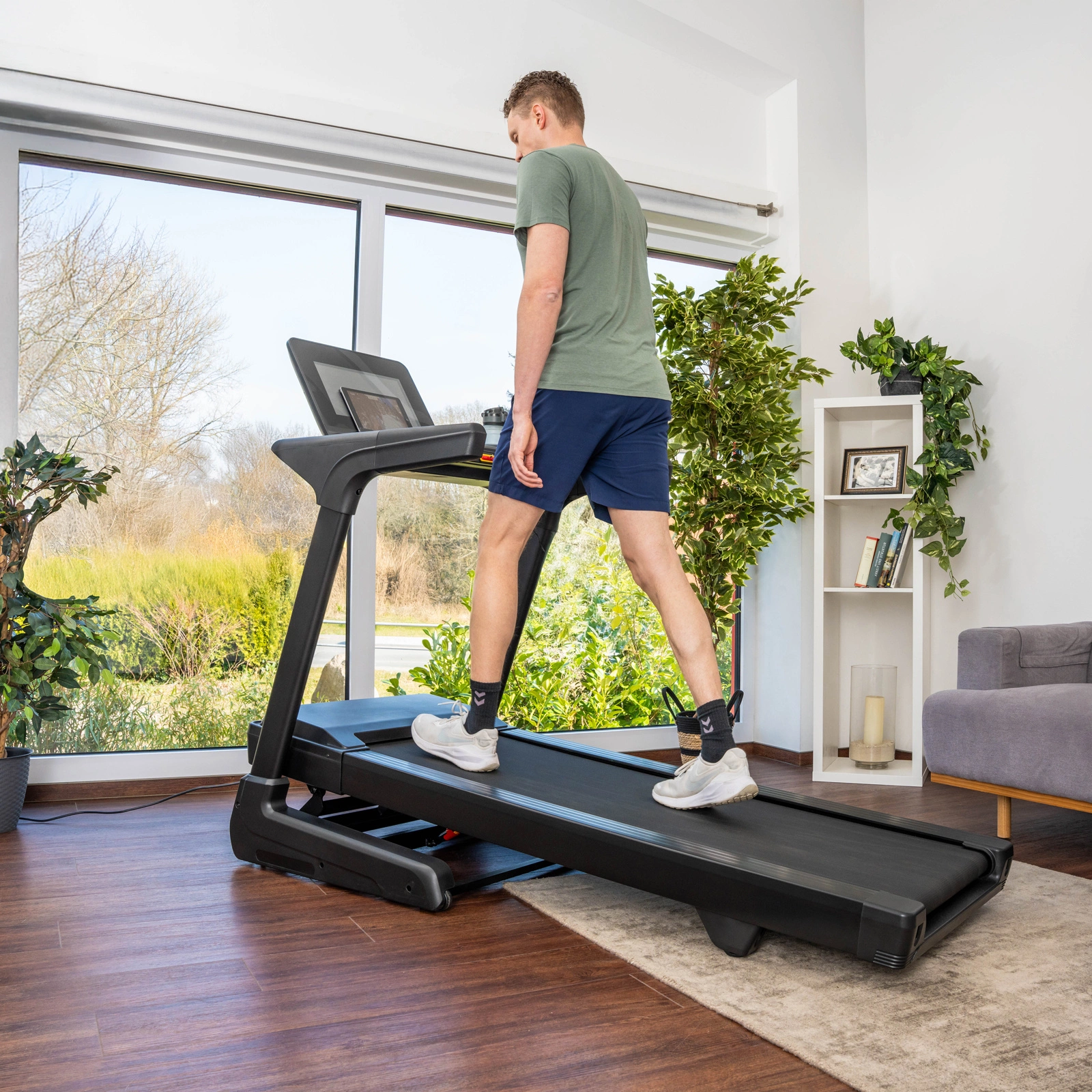Jednou z najväčších výhod tohto modelu je, že je to skladací bežecký pás. Mechanizmus rýchleho skladania umožňuje postaviť bežecký pás zvisle, a transportné kolieska uľahčujú jeho presunutie na ľubovoľné miesto v dome. Vďaka tomu elektrický bežecký pás nezaberie veľa miesta a výborne sa hodí do domácich podmienok, aj v menších bytoch.